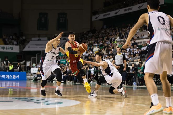 韩国媒体对于韩国能够双杀中国男篮十分兴奋,他们在报道的时候,恰好就用了韩国球员庆祝,胡明轩在旁边低着头的照片。