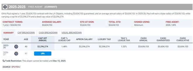 保罗跟快船签下的是一份一年的363万老将底薪,上一份合同跟马刺签下的是一年1046万,保罗能接受这份底薪重返快船就说明他对这支球队的爱意。