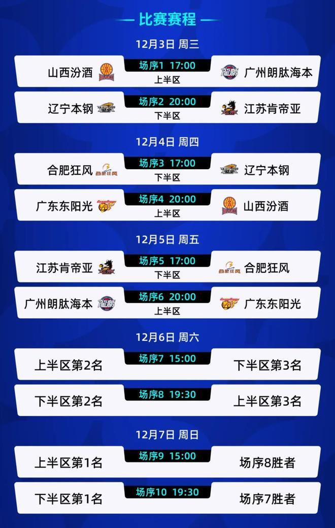 赛事从12月3日进行至12月7日,武汉赛区6支球队将分上下半区展开单循环较量,随后通过交叉淘汰赛决出晋级名额。3日的首个比赛日共进行两场对决,揭幕战在山西汾酒队与广州朗肽海本队之间展开,随后由江苏肯帝亚队与辽宁沈阳三生队展开对决。