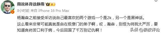 北京时间11月3日,网红篮球评论员徐静雨更新社媒发文:“杨瀚森之前接受采访说自己最喜欢的两个游戏一个是2k,另一个是黑神话。