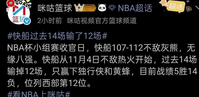 咪咕篮球(NBA杯小组赛收官日,快船107-112不敌灰熊,无缘八强。2025.11.29)