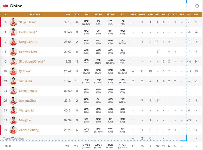 末节比赛,中国队本场比赛的进攻强点程帅澎崴脚伤退。球队此后改守联防,取得一定效果,打出一波12-0的小高潮。