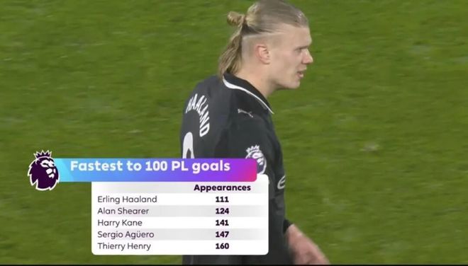 哈兰德的英超100球,左脚71球,右脚11球,头球17球,还有1球是臀部攻入。100球之中57球在主场,43球在客场,狼队是哈兰德进球最多的球队(10球),利物浦的安菲尔德则是他在英超唯一未能进球的球场。哈兰德在英超有1次大四喜,7次帽子戏法,17次梅开二度,只有6球是禁区外射入,是真正的禁区之王。哈兰德有30个进球是制胜球,45球改变比赛走势,足见对曼城的重要性。