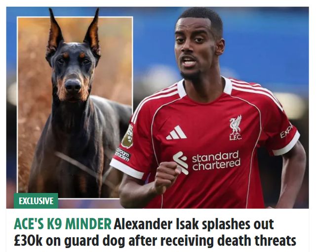 26岁的伊萨克,今年夏天从纽卡加盟利物浦,转会费高达1.45亿欧元(1.3亿英镑),是英超历史标王。11月22日,英国《太阳报》独家爆料,遭到死亡威胁的伊萨克,花3万英镑买下一只杜宾犬,守卫自己和家人的安全。
